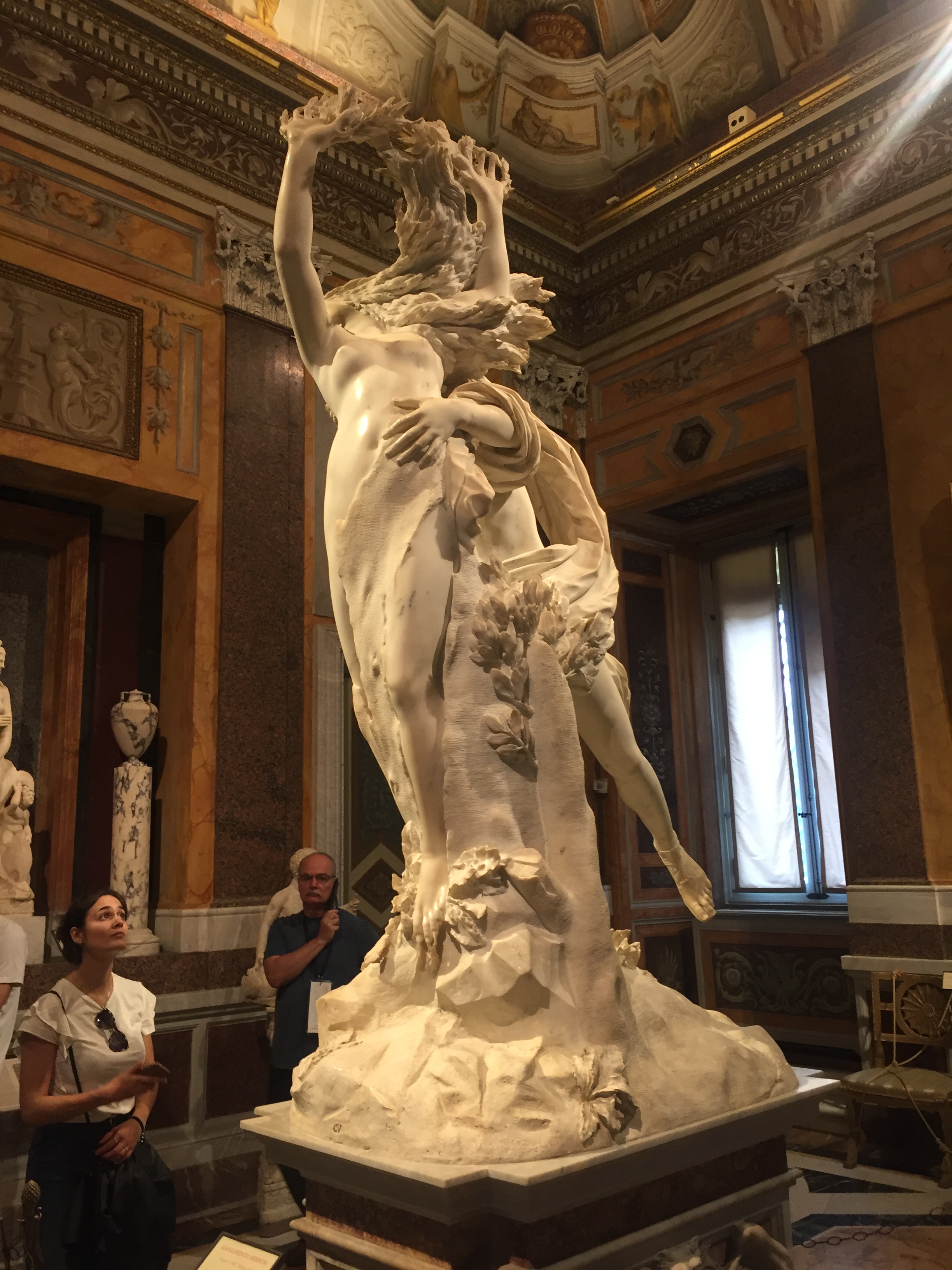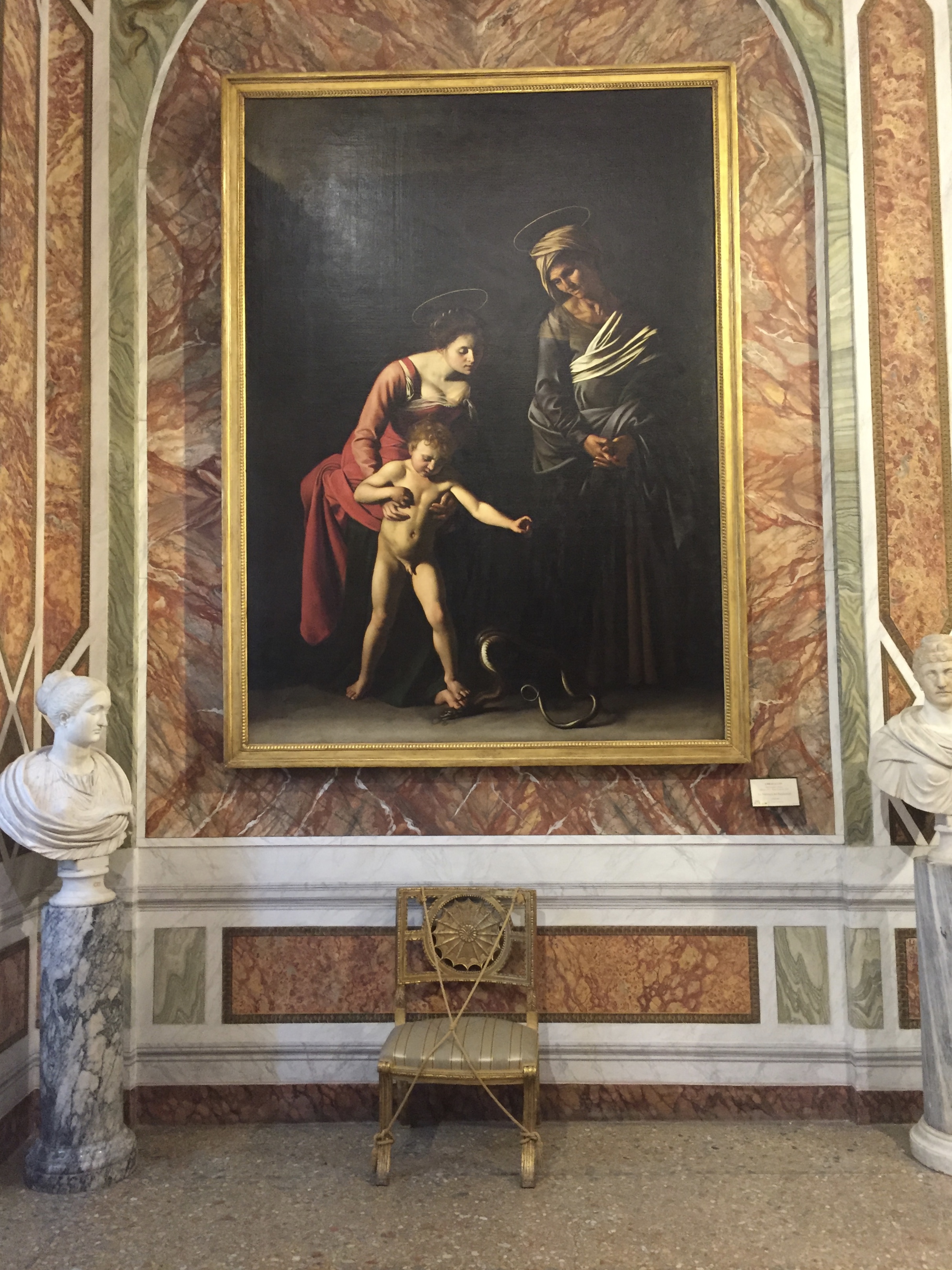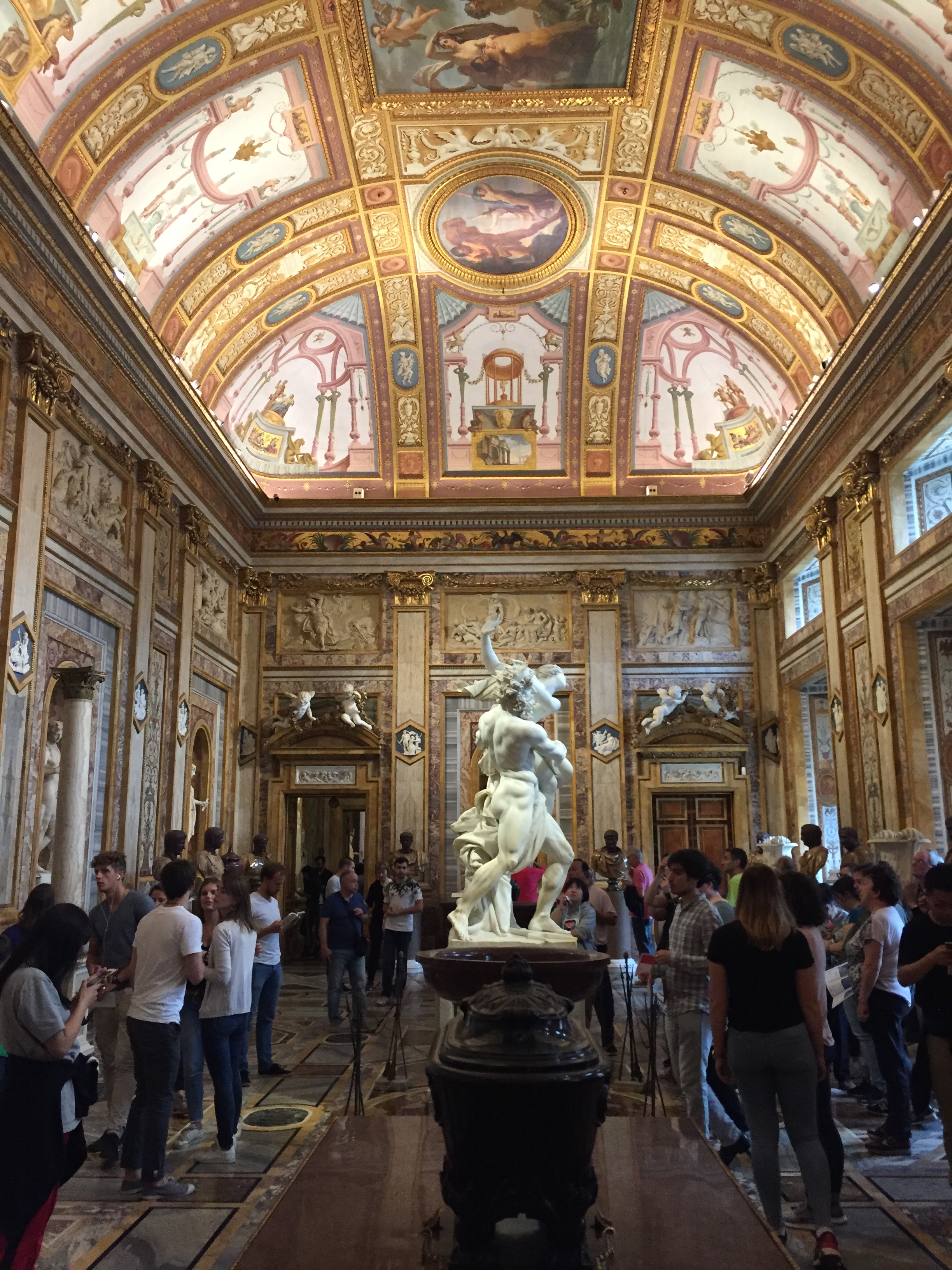 Auch auf meiner „must see“-Liste: die „Galleria Borghese“. Mein Bruder warnte mich noch vor: „Da musst du unbedingt das Ticket vorher reservieren!“ Jaja, dachte ich und wollte mich zeitlich nicht festlegen. Inzwischen weiß ich: unbedingt Tickets vorher reservieren!!! Ich hatte nur unglaubliches Glück, denn als ich dort antanzte, um Eintrittskarten für den nächsten Tag zu kaufen, stellte ich fest, dass die gesamte folgende Woche bereits ausgebucht war. Just in dem Moment war eine einzige Karte noch abrufbar. Also entschied ich mich das Kaffee-Trinken mit meinem Bruder zu verschieben und die Chance gerade mal noch eine Stunde durch die Räume zu laufen, anzunehmen. Und es hat sich mehr als gelohnt, denn wer auf Barock steht, dem geht das Herz auf! Und wer nicht auf Barock steht, muss zugeben, dass in dieser Zeit unfassbare Kunstwerke entstanden sind. Hier treffen Gemälde von Caravaggio auf Skulpturen von Bernini. Aber auch die großen Renaissance-Künstler Raffael, Tizian, Bellini oder Cranach sind bis zum Sattsehen vertreten! Zudem sind die Räume an sich schon einen Besuch wert. Die wunderbar dekorierten Räumlichkeiten mit Deckengemälden, kostbaren Marmorverkleidungen sowie Tür-, Tisch- und Wanddekorationen lassen in eine andere Zeit eintauchen- und Parallelen zur Gegenwart ziehen: An einer Decke sind Männer gemalt, die das Gewölbe stützen- mit einer definierten Muskulatur, die heutige Muckibuden-Besucher vor Neid erblassen lassen 😉 Spaß beiseite: die Galerie zählt zu den berühmtesten und wertvollsten privaten Kunstsammlungen der Welt und hat eine hochspannende Geschichte, die Italien und Frankreich nicht unbedingt freundschaftlich miteinander verbindet- Stichwort Napoleon…