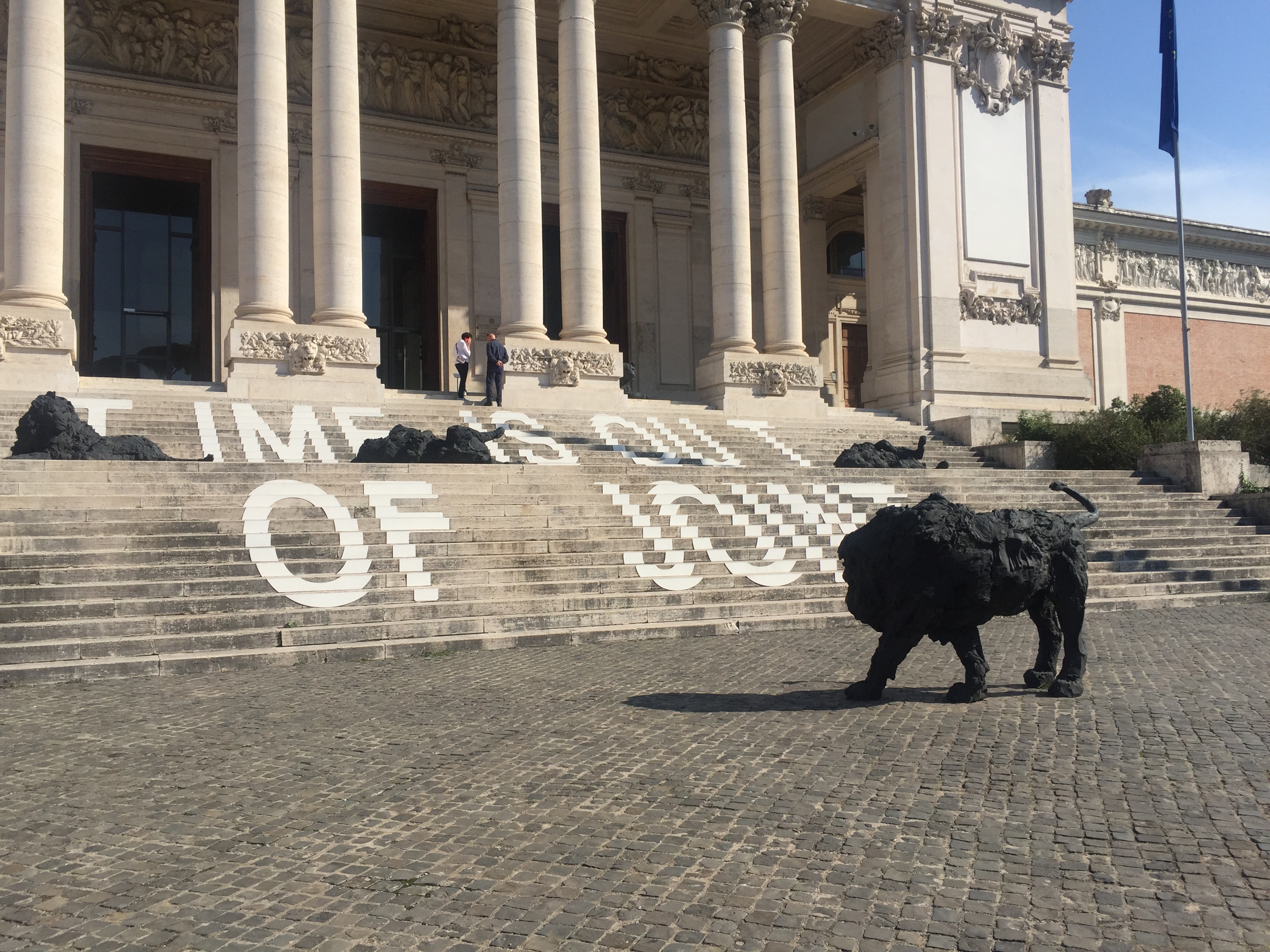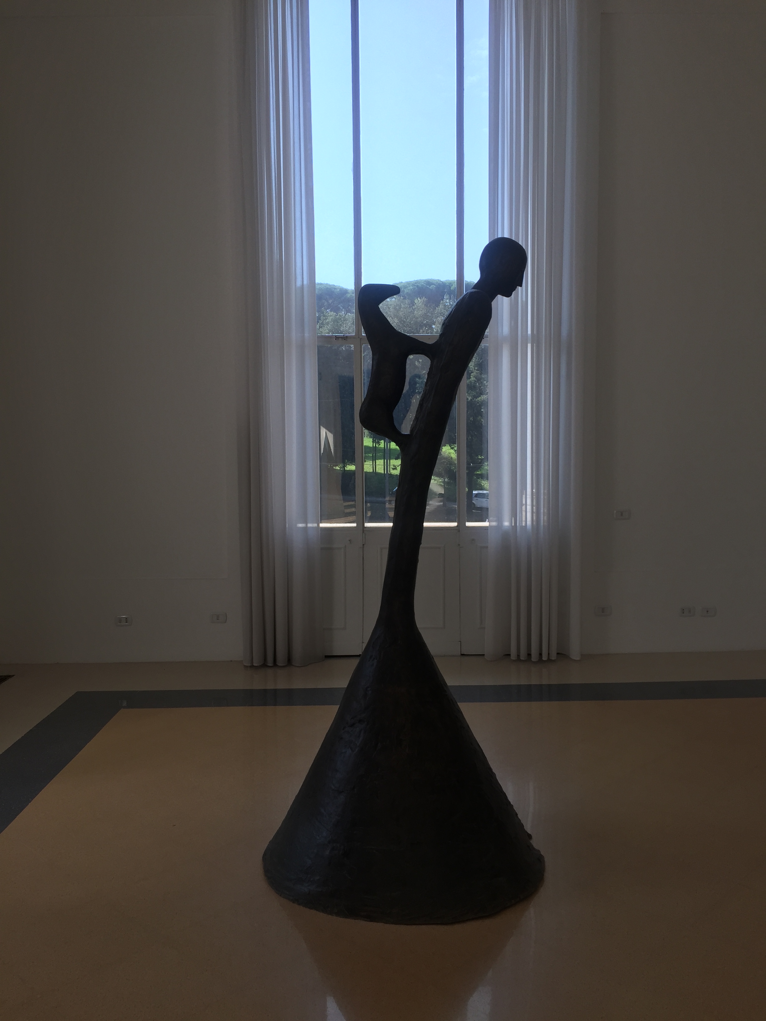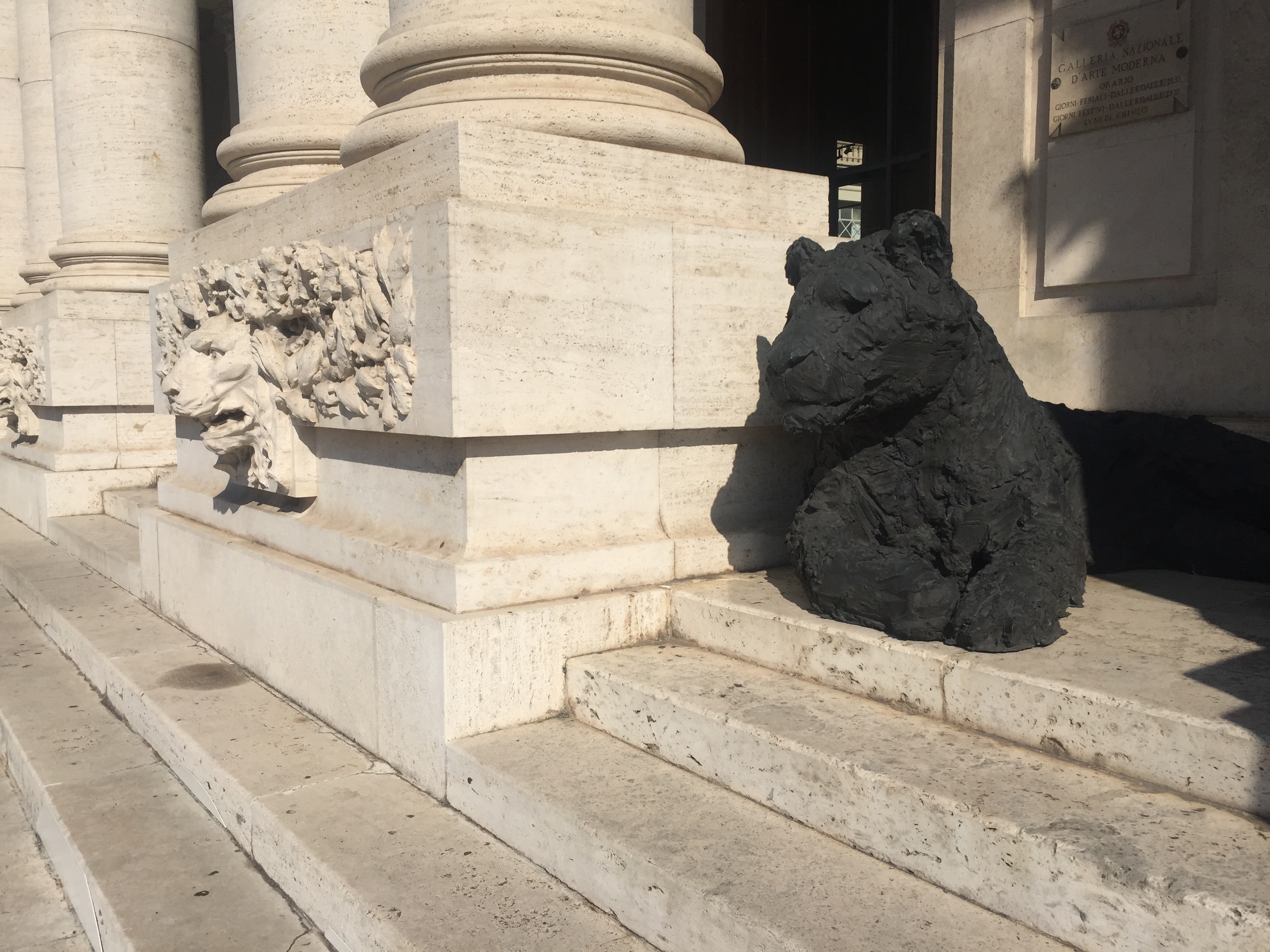 Auch das dritte Museum möchte ich euch schwer ans Herz legen: die Nationalgalerie. Sie beherbergt die größte Sammlung von Werken italienischer Maler des 19. und 20. Jahrhunderts. Schon alleine das Gebäude ist beeindruckend- erst recht mit den schwarzen Löwen, die momentan auf den Stufen herumlungern und Zwiegespräche mit den antiken Löwenköpfen in den Sockeln der Eingangssäulen zu halten scheinen. Innen erwarten einen gigantisch hohe, lichtdurchflutete Räume. Im Erdgeschoss finden wechselnde Ausstellungen eine Heimat- diesmal mit dem Titel „Time is out of joint“ (das Zitat eines Shakespeare-Verses) eine besonders abwechslungsreiche, spannungsgeladenen und auch sehr witzige Zusammenstellung klassischer und zeitgenössischer Kunst und gleichzeitig ein Dankeschön für die Komplettrenovierung des ganzen Gebäudes (es hängen nebeneinander: Paul Cézanne, Giorgio De Chirico, Marcel Duchamp, Lucio Fontana, Alberto Giacometti, Francesco Hayez, Gustav Klimt, Joseph Kosuth, Jannis Kounellis, Amedeo Modigliani, Piet Mondrian, Vincent van Gogh to Marion Baruch, Cristina Lucas, Adrian Paci, Alessandro Piangiamore, Luca Rento, Sophie Ristelhueber- um nur ein paar zu nennen…). Aber auch die ständige Sammlung ist irgendwie unkonventionell präsentiert. In einem Raum stehen auf einem riesigen Tisch, der wie ein provisorischer Tapeziertisch, zahlreiche größere und kleinere Skulpturen aus verschiedensten Epochen. Jede hat ein preisartiges Schildchen umgehängt, auf dem Künstler, Titel und Entstehungsjahr handschriftlich zu lesen sind. Alleine für diesen Raum kann man locker eine Stunde rechnen, denn es macht großen Spaß, sich durch die Reihen zu raten…