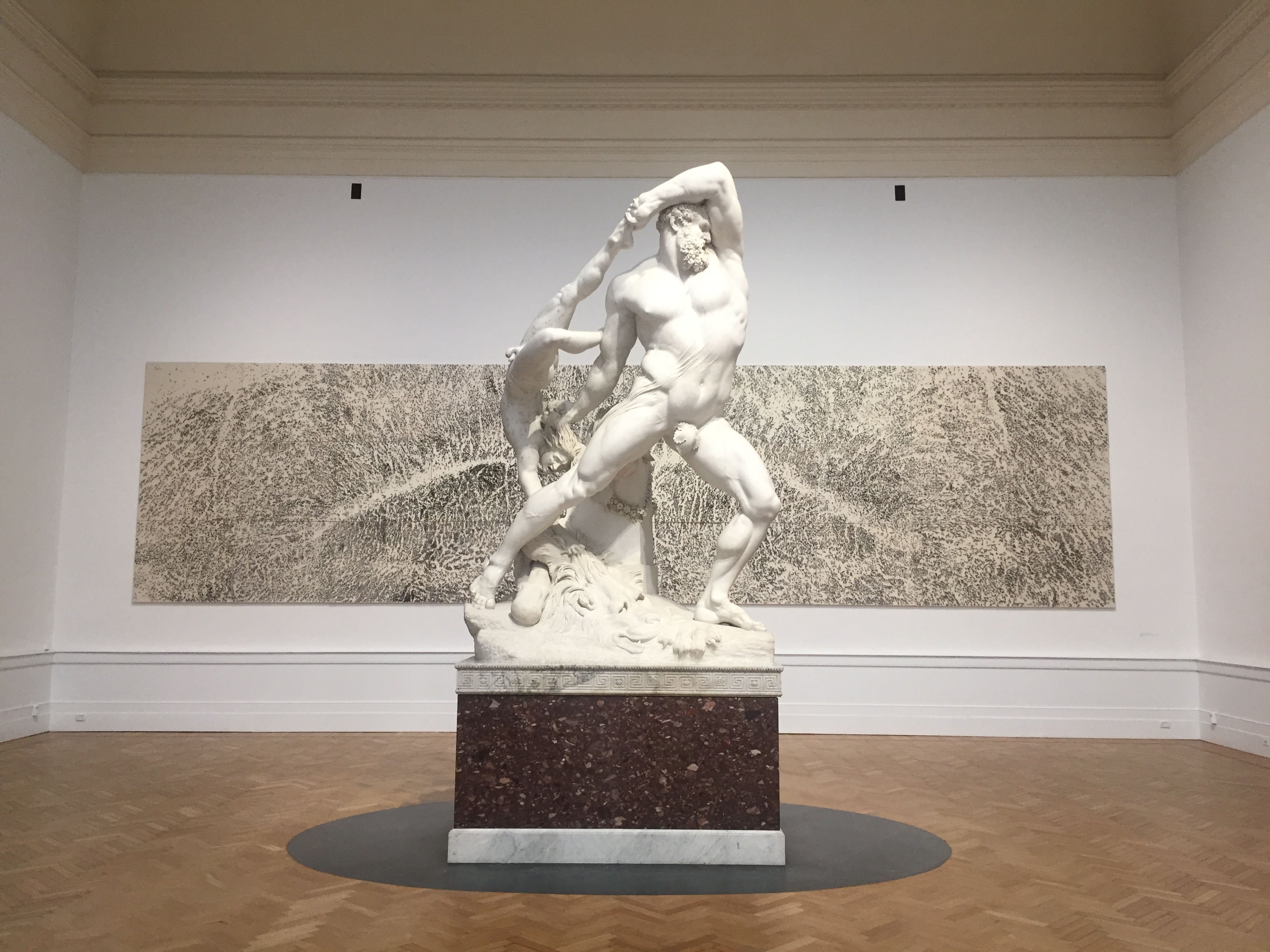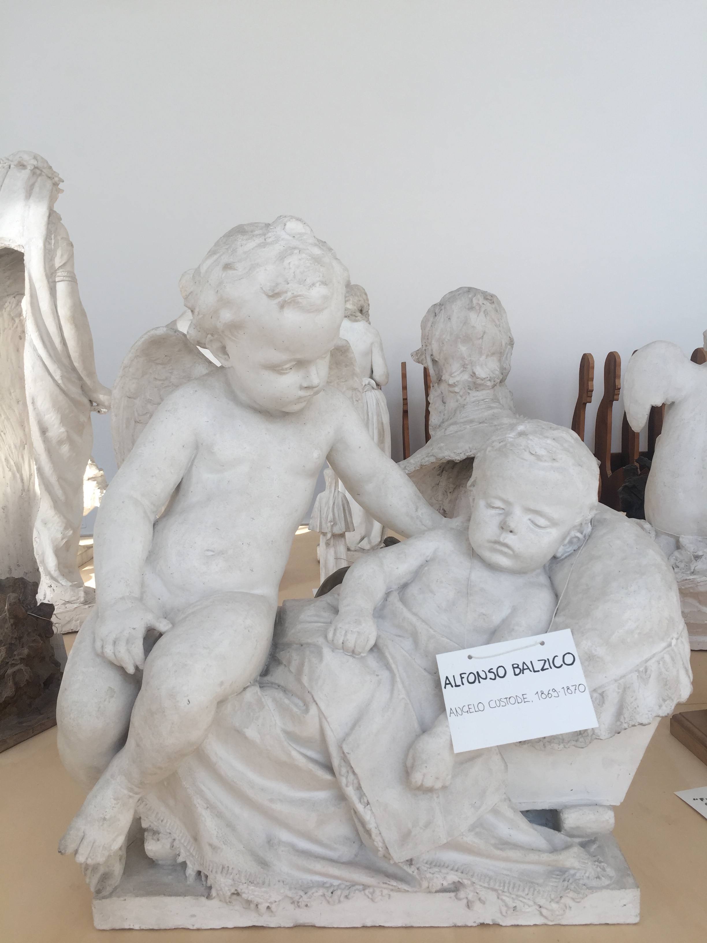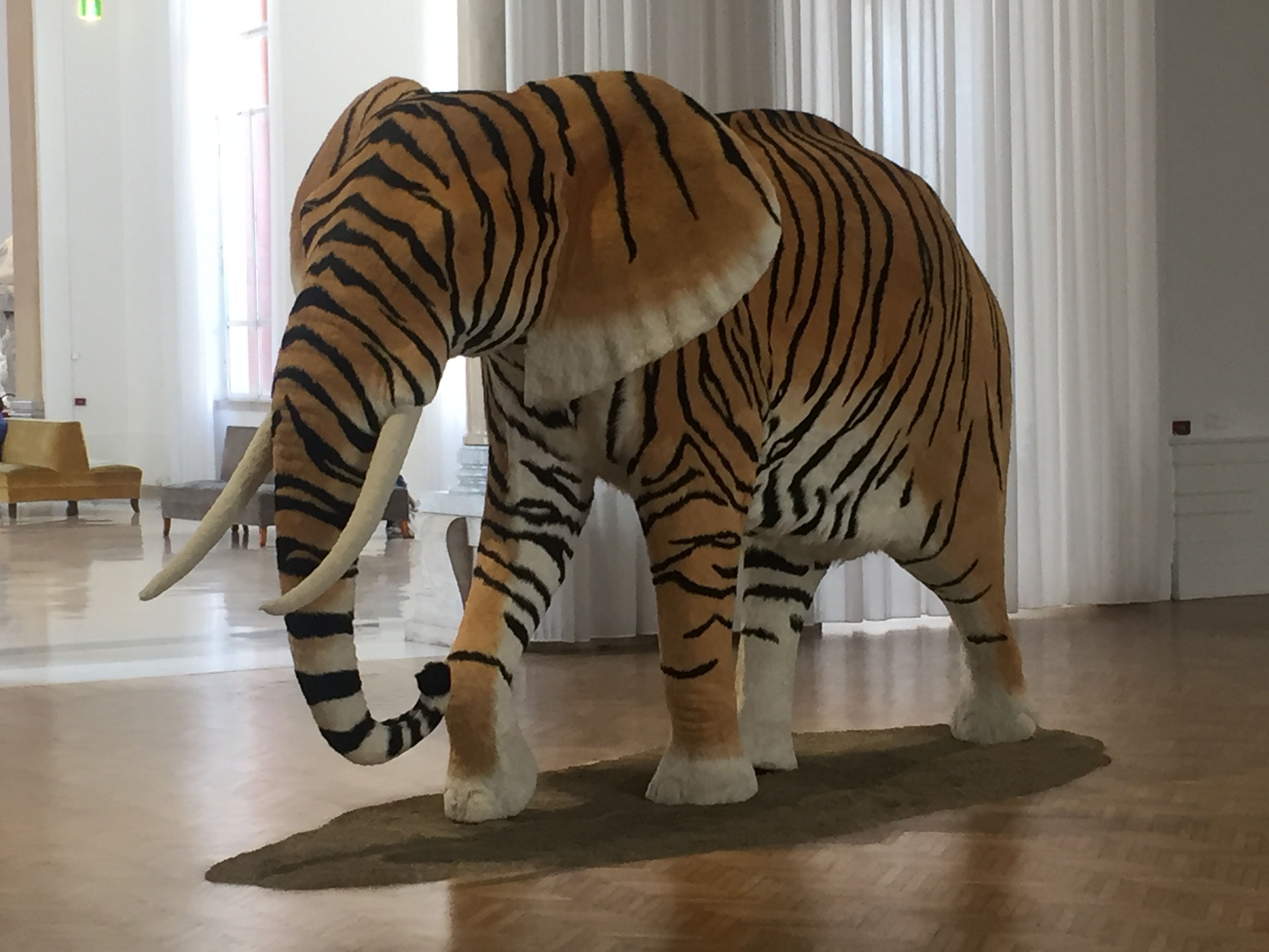 Auch das dritte Museum möchte ich euch schwer ans Herz legen: die Nationalgalerie. Sie beherbergt die größte Sammlung von Werken italienischer Maler des 19. und 20. Jahrhunderts. Schon alleine das Gebäude ist beeindruckend- erst recht mit den schwarzen Löwen, die momentan auf den Stufen herumlungern und Zwiegespräche mit den antiken Löwenköpfen in den Sockeln der Eingangssäulen zu halten scheinen. Innen erwarten einen gigantisch hohe, lichtdurchflutete Räume. Im Erdgeschoss finden wechselnde Ausstellungen eine Heimat- diesmal mit dem Titel „Time is out of joint“ (das Zitat eines Shakespeare-Verses) eine besonders abwechslungsreiche, spannungsgeladenen und auch sehr witzige Zusammenstellung klassischer und zeitgenössischer Kunst und gleichzeitig ein Dankeschön für die Komplettrenovierung des ganzen Gebäudes (es hängen nebeneinander: Paul Cézanne, Giorgio De Chirico, Marcel Duchamp, Lucio Fontana, Alberto Giacometti, Francesco Hayez, Gustav Klimt, Joseph Kosuth, Jannis Kounellis, Amedeo Modigliani, Piet Mondrian, Vincent van Gogh to Marion Baruch, Cristina Lucas, Adrian Paci, Alessandro Piangiamore, Luca Rento, Sophie Ristelhueber- um nur ein paar zu nennen…). Aber auch die ständige Sammlung ist irgendwie unkonventionell präsentiert. In einem Raum stehen auf einem riesigen Tisch, der wie ein provisorischer Tapeziertisch, zahlreiche größere und kleinere Skulpturen aus verschiedensten Epochen. Jede hat ein preisartiges Schildchen umgehängt, auf dem Künstler, Titel und Entstehungsjahr handschriftlich zu lesen sind. Alleine für diesen Raum kann man locker eine Stunde rechnen, denn es macht großen Spaß, sich durch die Reihen zu raten…
